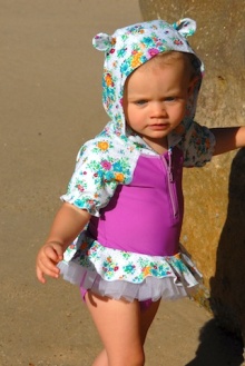 紫外線防止加工もされておりますし、フードも付いておりますので、ベビーちゃんのカワユイうなじが日焼けで赤くなる事も、予防出来ますね